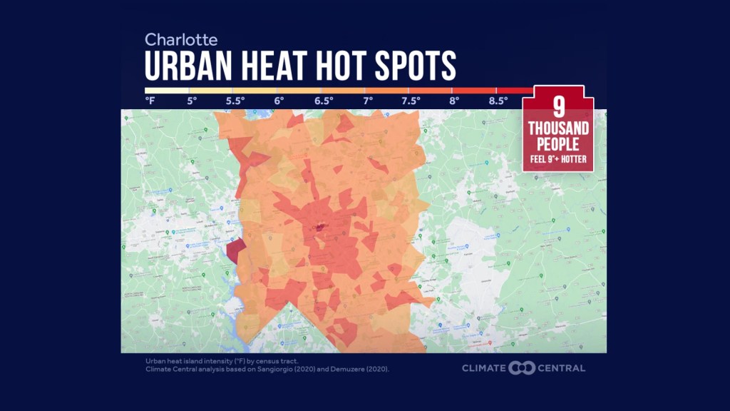 In Charlotte, this effect is particularly pronounced. For instance, about 9,000 people endure temperatures at least 9 degrees hotter than the area’s baseline summer temperature. Two notable areas suffering the brunt of this effect are Uptown Charlotte, with its dense grid of skyscrapers, and an area south of Belmont in Gaston County, which includes shopping centers, schools, and sprawling residential neighborhoods (source).