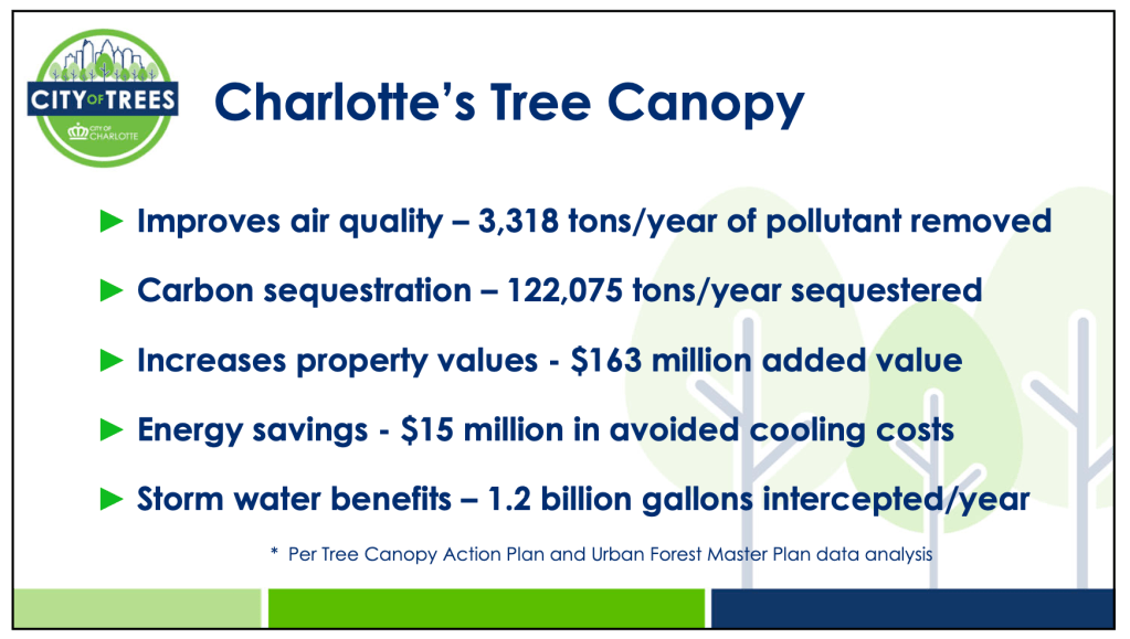 - Stormwater Management: Charlotte’s tree canopy helps absorb rainwater, reducing stormwater runoff and the risk of flooding during heavy rainfall. (source)