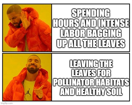 When leaves fall, they create a natural blanket that helps insulate tree roots through the winter, slowly breaks down into healthy, nutrient-rich soil, and provides critical shelter for overwintering insects like moths, butterflies, and fireflies. In other words, when we let leaves do their thing, we’re giving a boost to pollinators, birds, soil health, and next spring’s garden all at once.